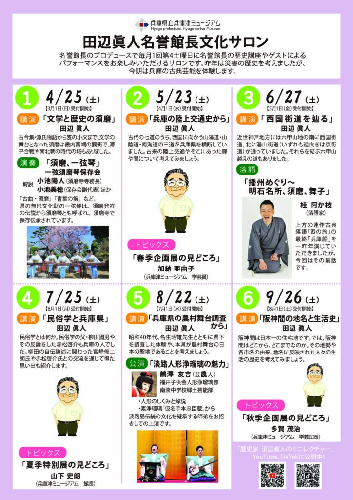 | 内容 | 講演 「兵庫の陸上交通史から」/ 田辺眞人 名誉館長 古代の七道のうち、西国に向かう山陽道・山陰道・南海道の三道が兵庫県を横断していました。古来の陸上交通や、そこにあった驛や関について考えてみましょう。 トピックス「春季企画展の見どころ」/ 加納 亜由子(兵庫津ミュージアム学芸員) |