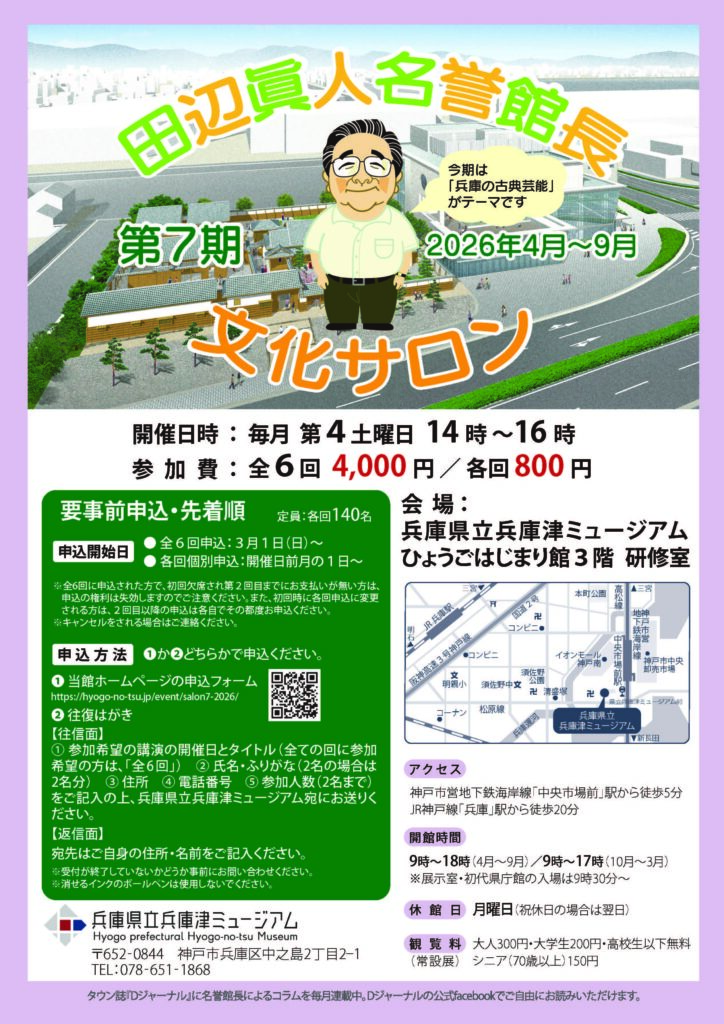 | 内容 | 講演「阪神間の地名と生活史」/ 田辺眞人 名誉館長 阪神間は日本一の住宅地です。では、阪神間はどこから、どこまでなのか。その地勢や各市名の由来、地名に反映された人々の生活の歴史を考えてみましょう。 トピックス「秋季企画展の見どころ」/ 多賀 茂治(兵庫津ミュージアム学芸班長) |